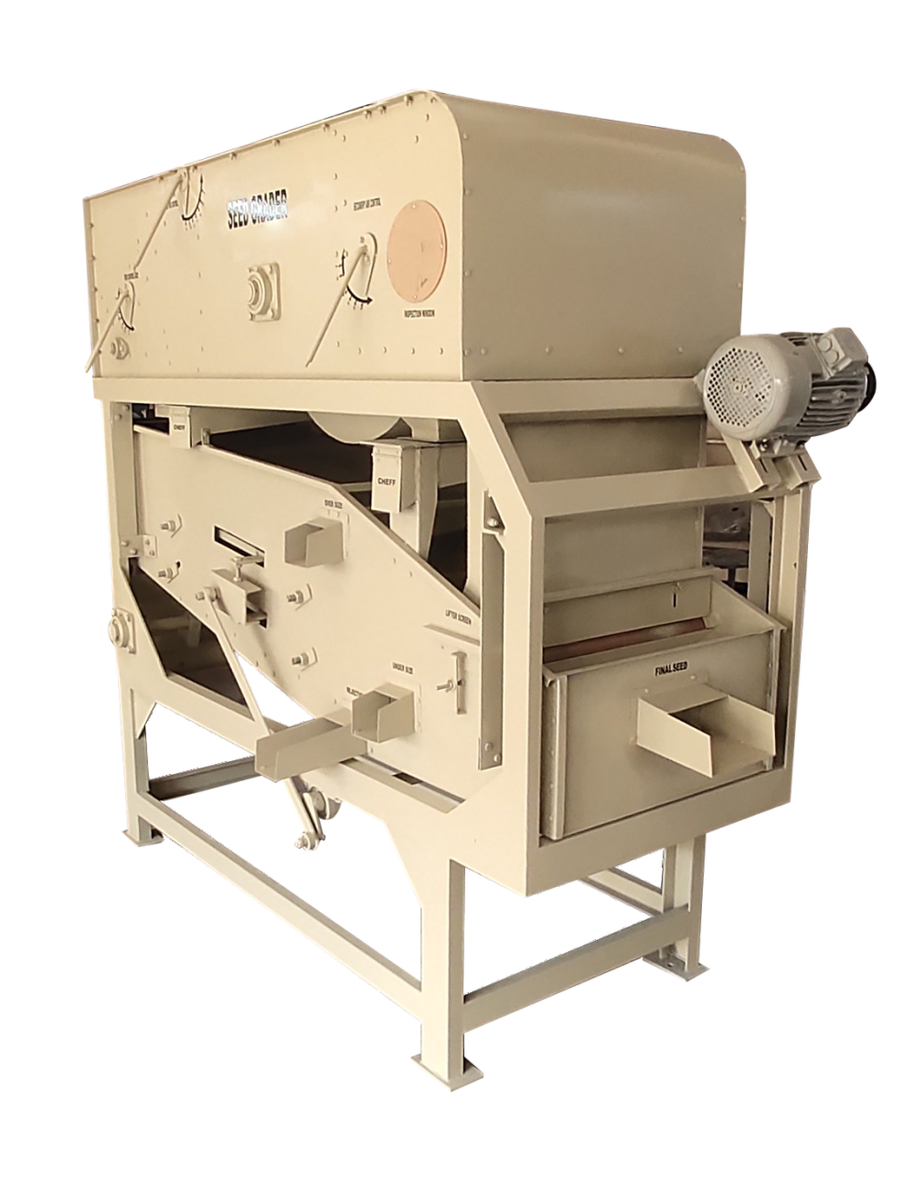 New Tech Agro Industries Offers a range of pre-cleaners suitable for seeds, grains, and pulses, including models like Maximo-50/25 and PC 2. we Provides seed pre-cleaners designed for efficient cleaning, such as the AAI/APC4 model with a capacity of 4 TPH and 7.5 HP power. Made of durable metal material, this cleaner comes with a human machine interface control system and offers a warranty for added peace of mind. Cleaning Grading Capacity on Wheat bases at 12% moisture content and 10% Impurities. Used for efficient cleaning of all types of cereal grains, paddy, rice, wheat, malting barley, coffee seeds etc.